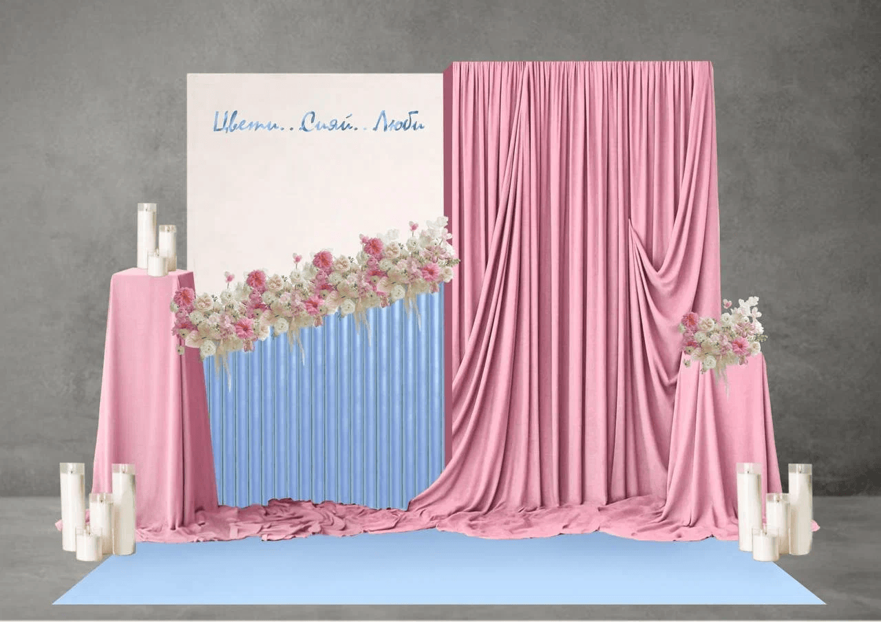 - Задник: половина баннер, половина декорирована тканью. Баннер украшен флористикой и веерами