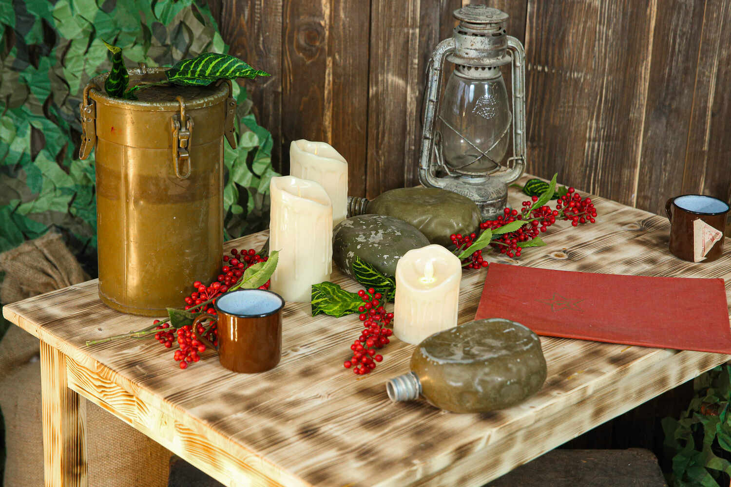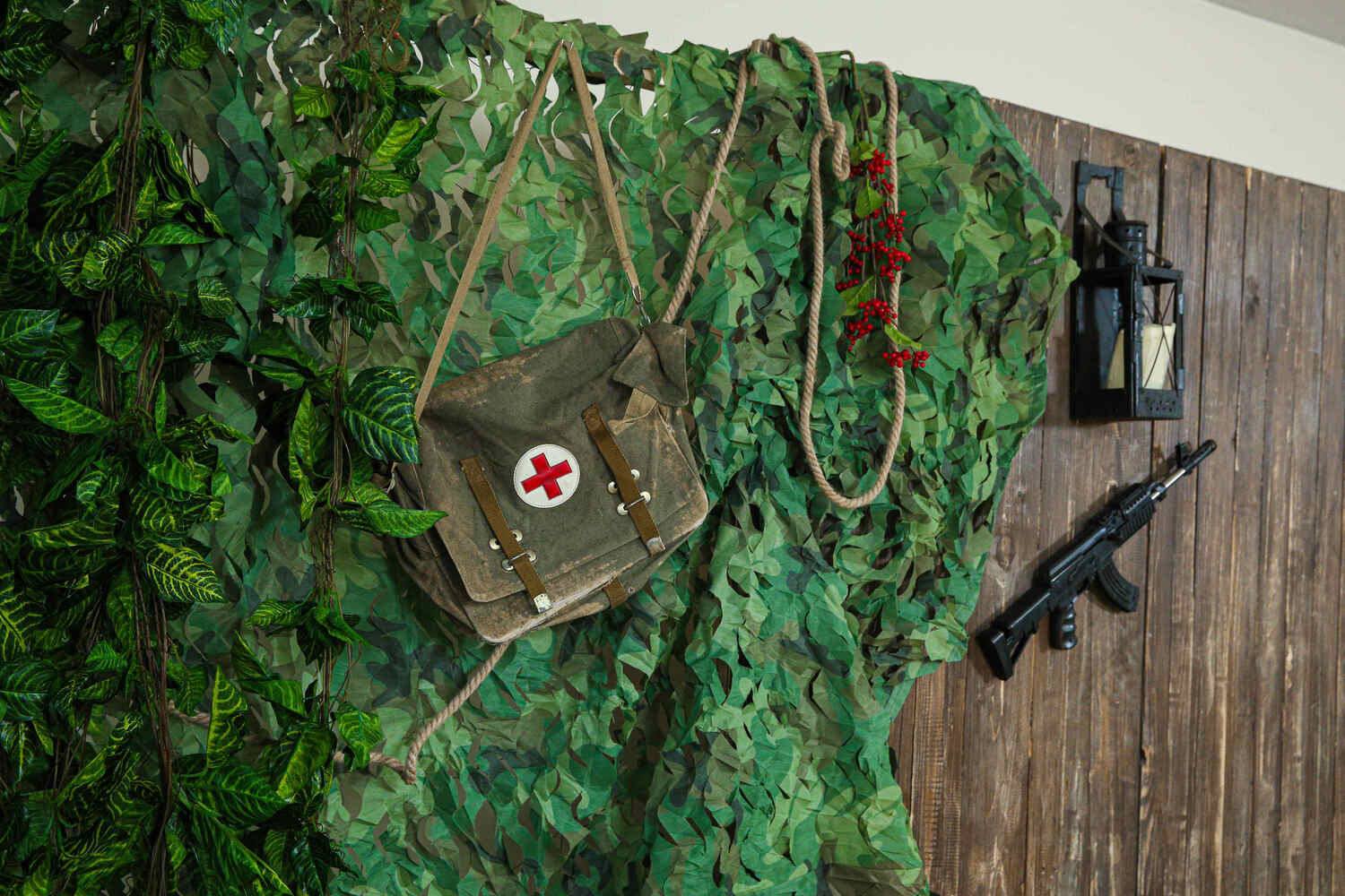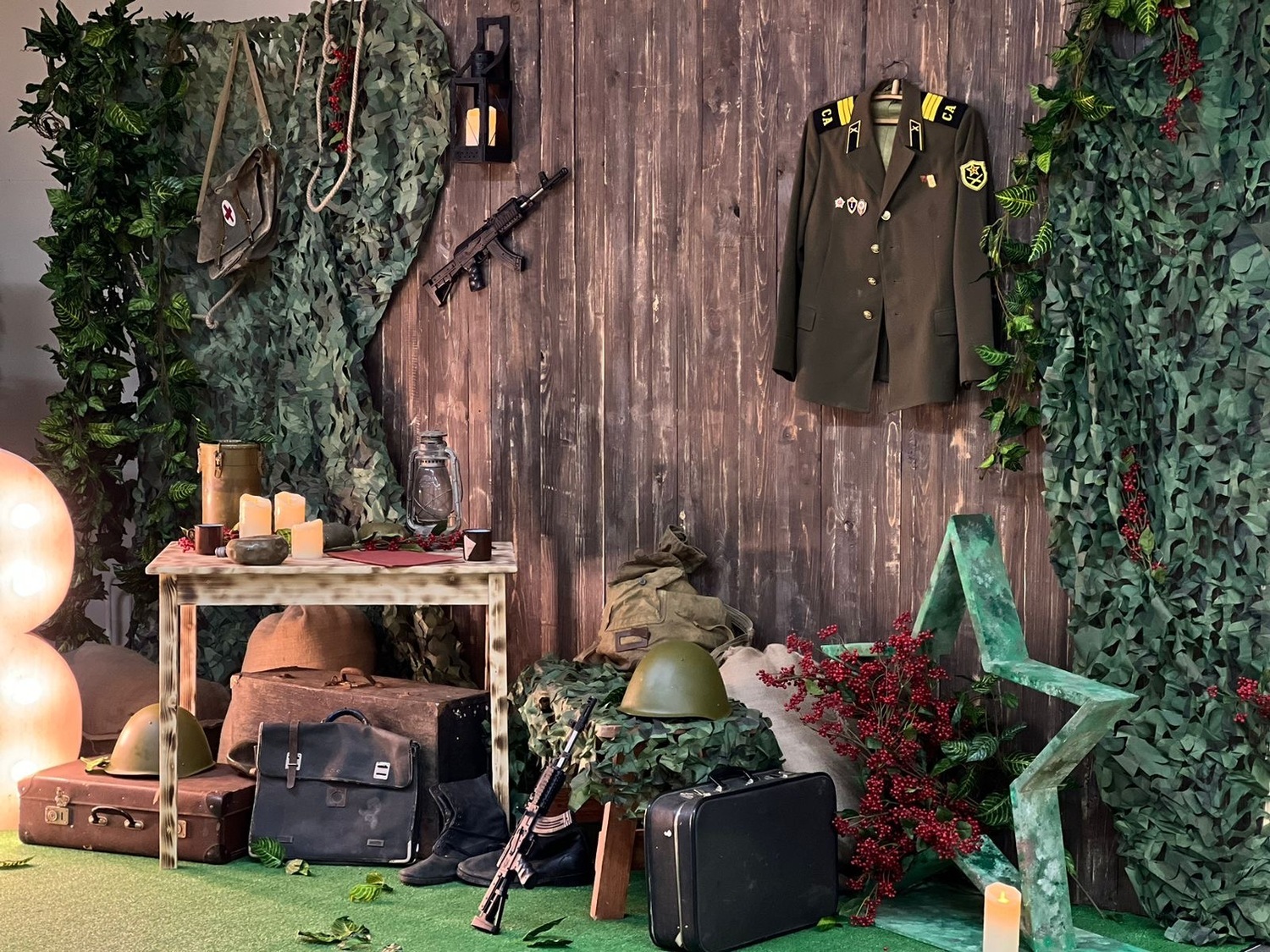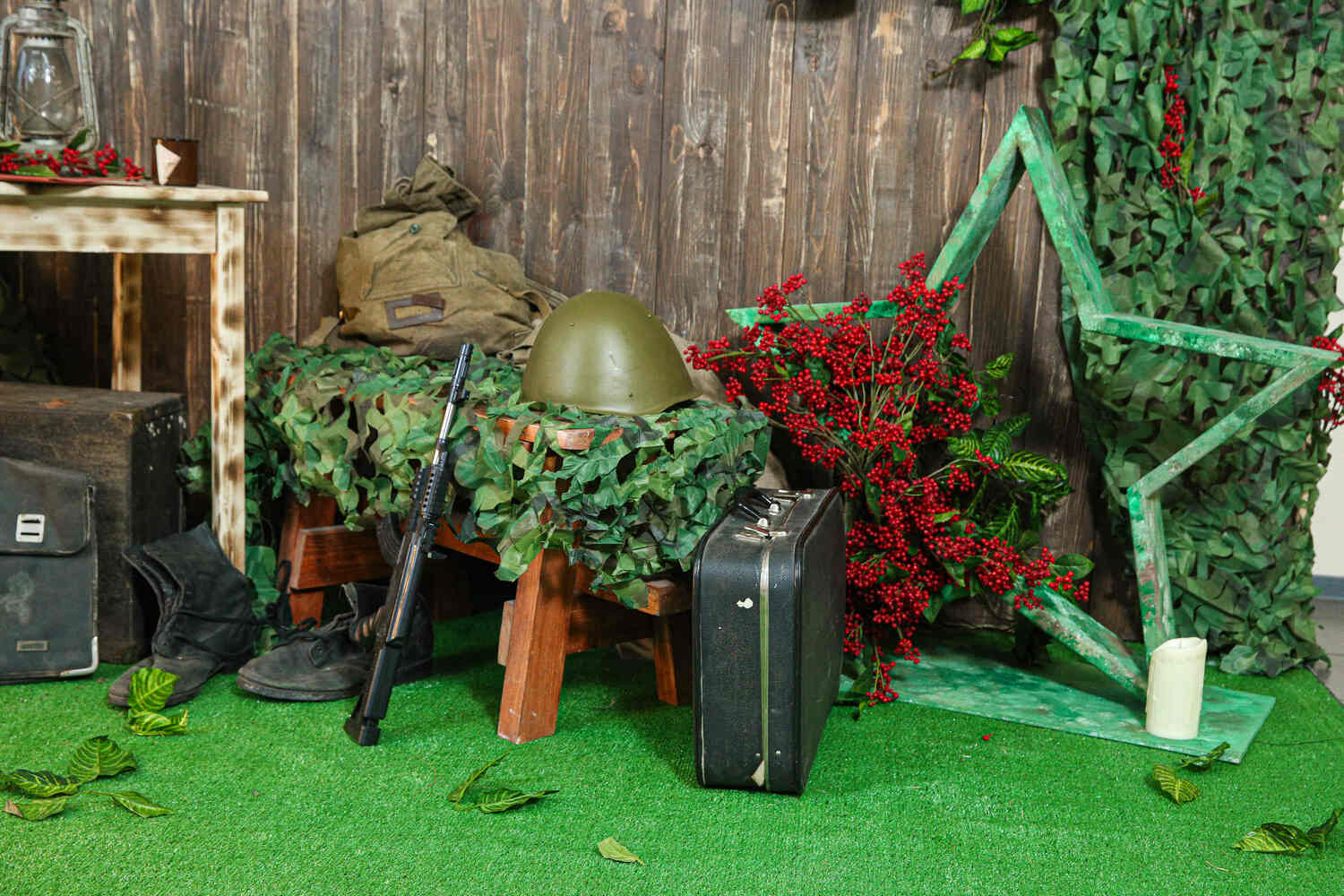 - Декоративные элементы: шинель, сапоги, вещмешок, скамейка, стол, каска, автомат декоративный, фляжка, декоративная зелень, чемоданы – 3 шт.